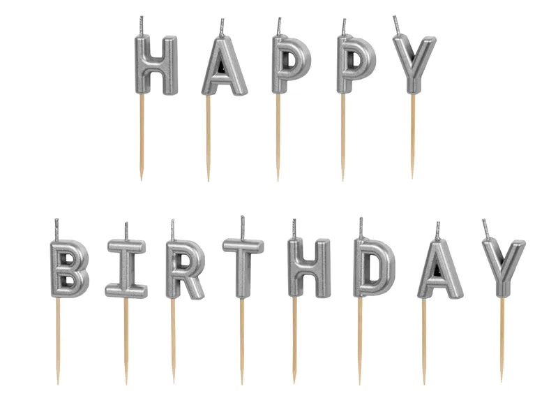 Stylowy akcent na wyjątkowe chwile! Srebrne świeczki urodzinowe w formie liter układających się w napis „Happy Birthday” to elegancki i efektowny dodatek do każdego tortu.